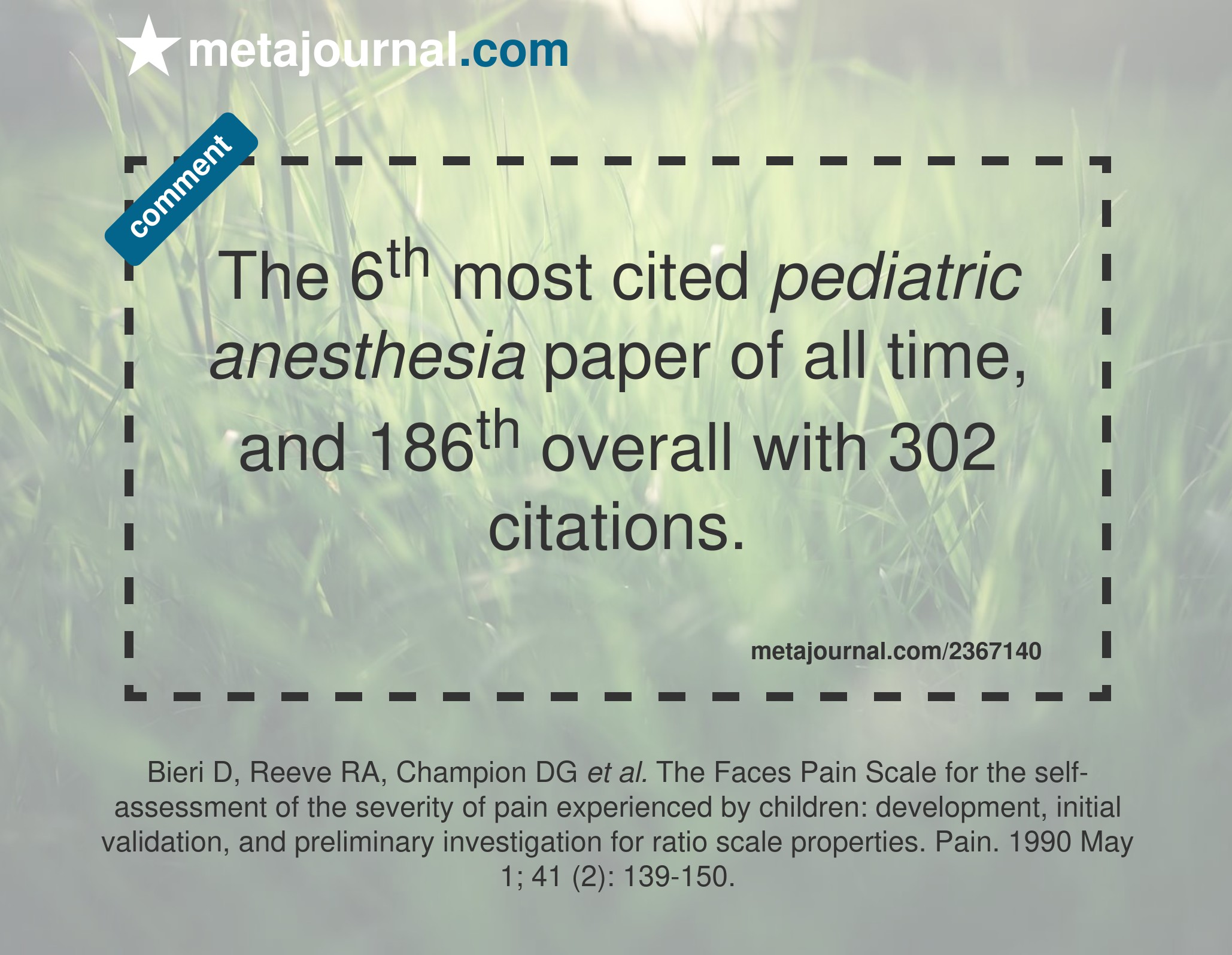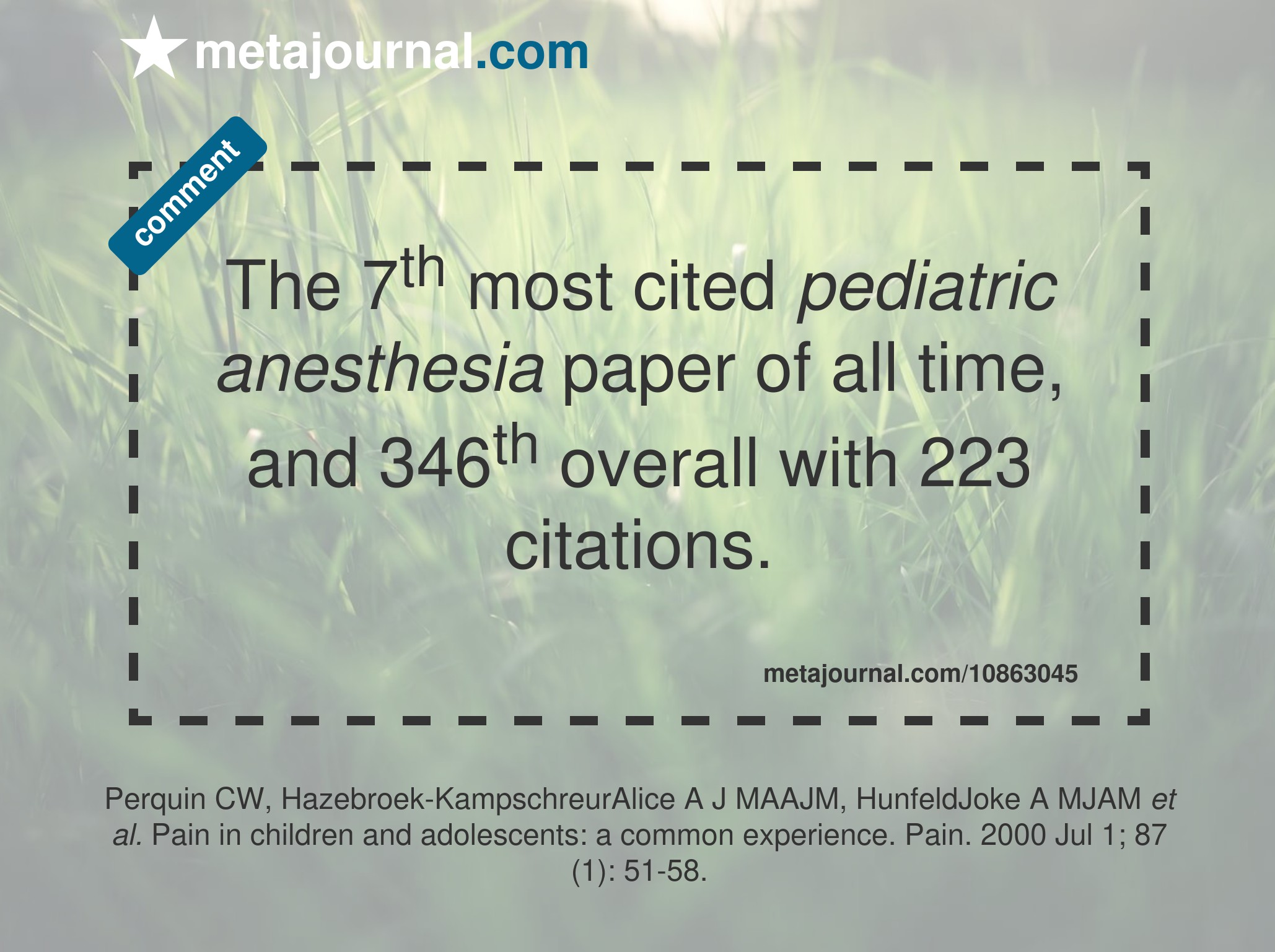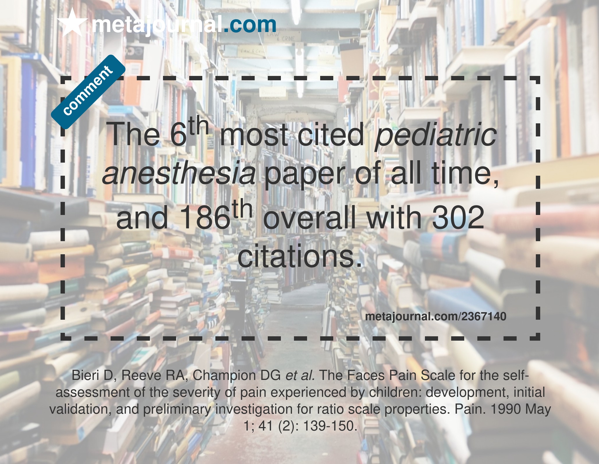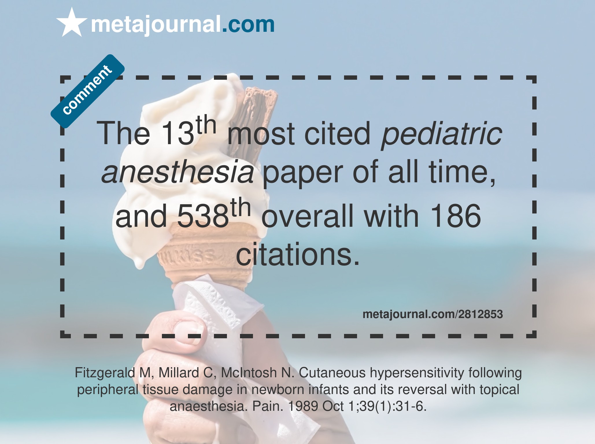 The 13th most cited pediatric anesthesia paper of all time, and 538th overall with 186 citations.